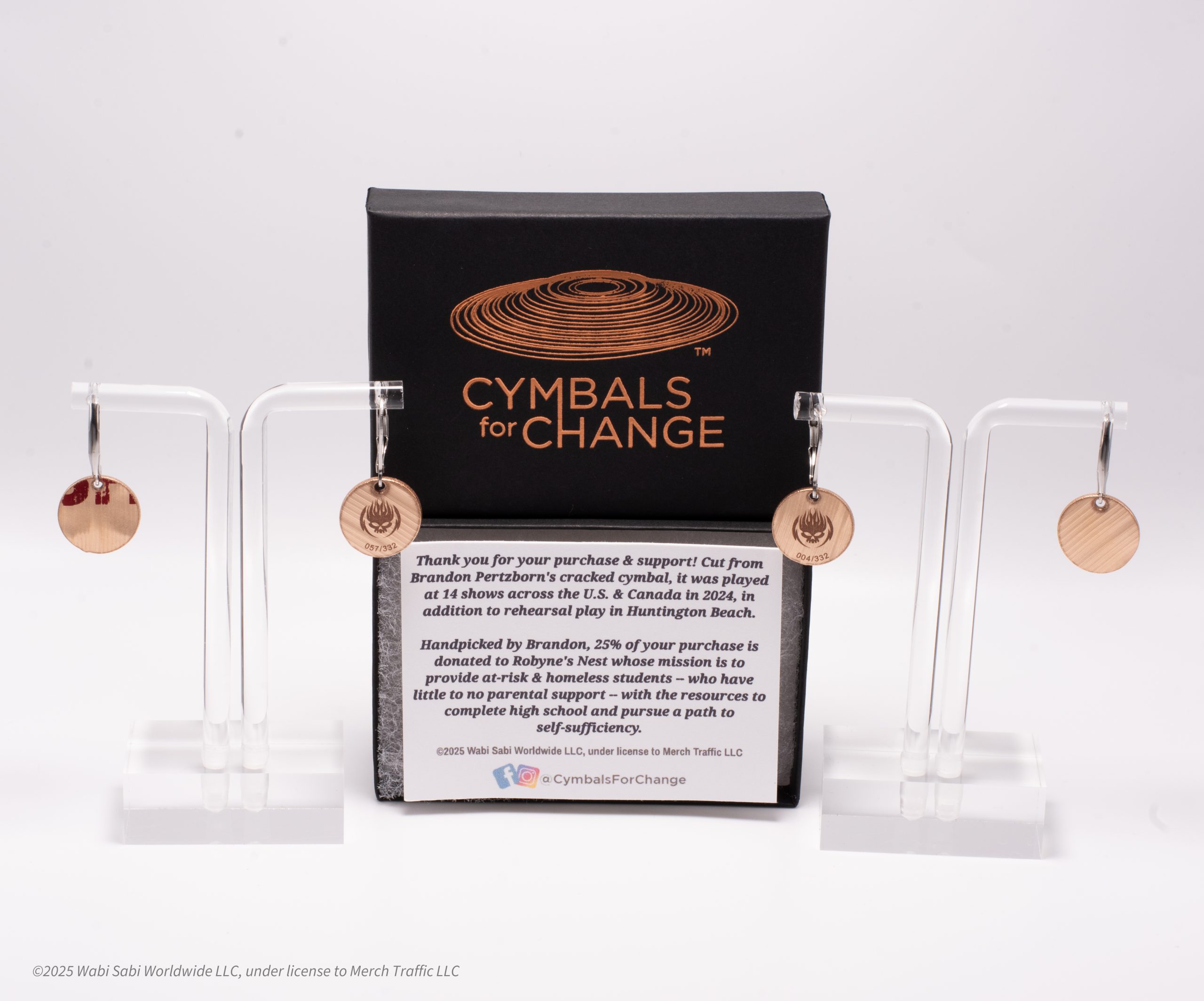 We’ve partnered up with Brandon Pertzborn and The Offspring to cut & engrave one of Brandon’s retired cymbals into custom-engraved, one-of-a-kind earring pendants. Each pendant is engraved with The Offspring’s hard-hitting bolt logo in addition to a unique serial code. Each pendant is attached to a 304 surgical-grade stainless steel leverback ear wire. 25% of each sale is reserved for Robyne’s Nest. Less than 60 pairs of earrings were carefully crafted – grab yours before they’re gone!