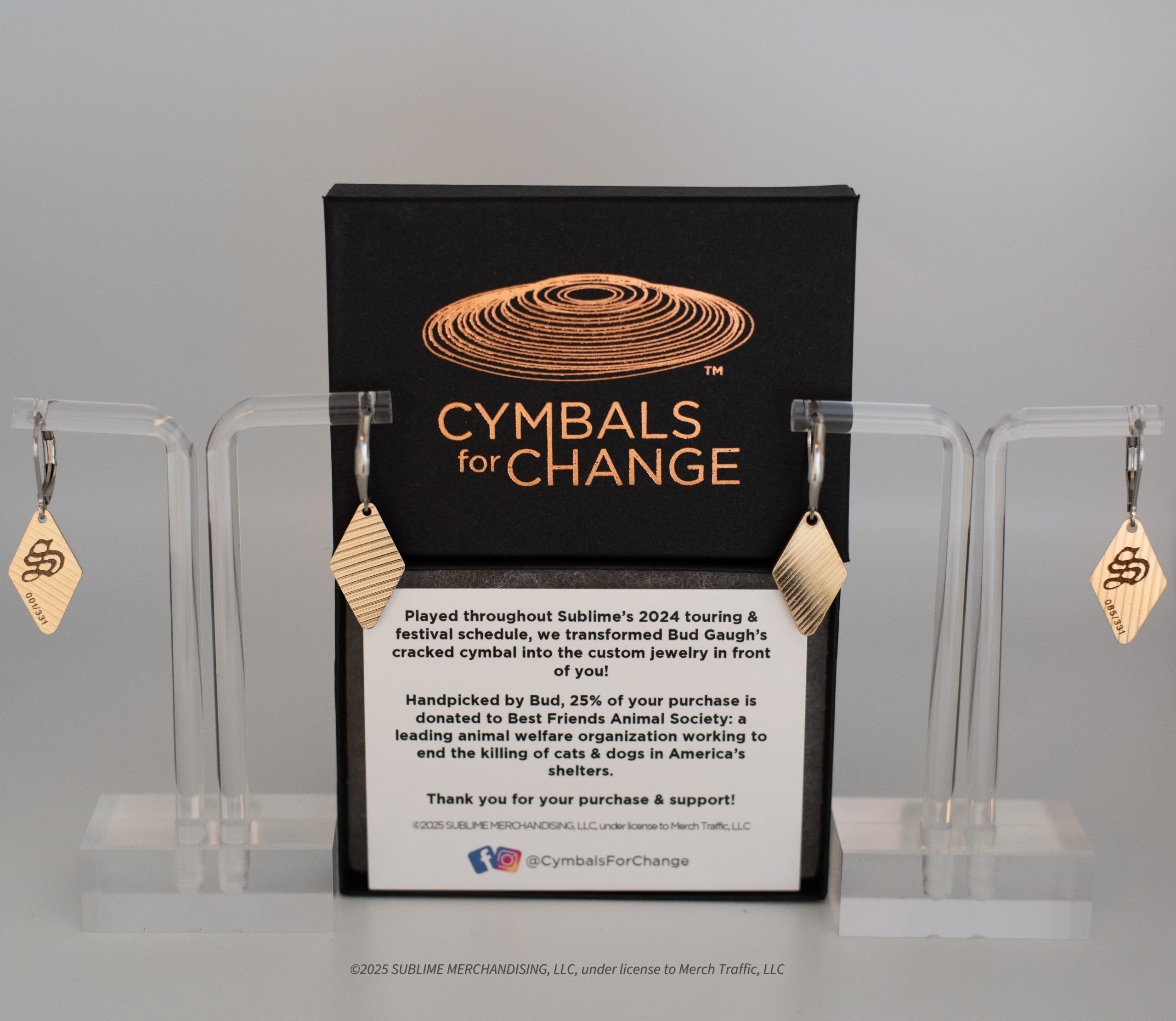 We’ve partnered up with Bud Gaugh and Sublime to cut & engrave one of Bud’s retired cymbals into custom-engraved, one-of-a-kind earring pendants. Each pendant is engraved with Sublime’s logo in addition to a unique serial code. Each pendant is attached to a 304 surgical-grade stainless steel leverback ear wire. 25% of each sale is reserved for Best Friends Animal Society. Less than 60 pairs of earrings were carefully crafted – grab yours before they’re gone! On sale Sept. 23 @ 10:00am PST